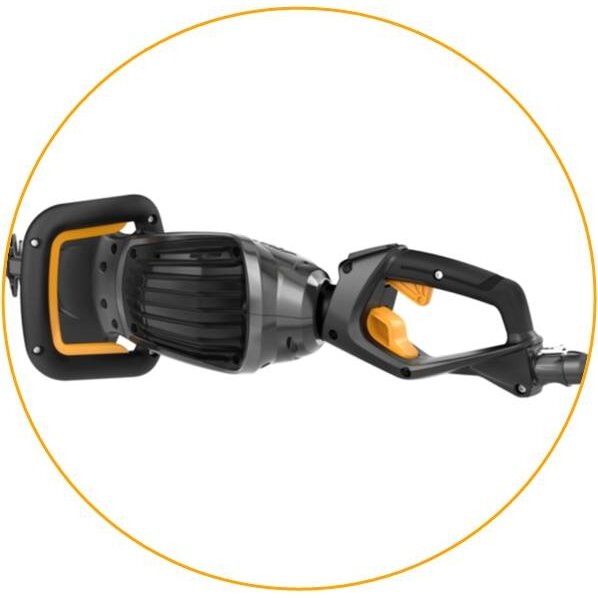 900-osios E-Power serijos gyvatvorių žirklės, veikiančios naudojant akumuliatorių kuprine. Tereikia prijungti maitinimo laidą ir įrankis jau paruoštas darbui. Inovatyvus dizainas, tvirta bet lengva konstrukcija, aukštas našumo lygis. Aliuminio bei karbono, 65 cm. ilgio, dvigubi pjovimo ašmenys užtikrina itin tikslų pjovimą bei suteikia augmenijai tobulą formą. Dėka plačių 40 mm. tarpų tarp pjovimo dantukų šiomis žirklėmis nesunkiai galima nukirpti net iki 33 mm. storio šakas. Priekinė kilpinė rankena padeda išlaikyti patogią darbinę poziciją, o ašmenų apsauga – optimaliam saugumui užtikrinti. Daugiafunkcinę galinę, 180° kampu pasisukančią rankeną galima nustatyti į 3 skirtingas pozicijas, kad būtų galima atlikti įvairiapusį pjovimą, tuo pačiu leidžianti naudotojui išlaikyti natūralią rankos ir riešo padėtį dirbant. Taip pat galima pasirinkti vieną iš 3 veikimo greičių parinkčių, naudojantis intuityvia klaviatūra, įmontuota rankenoje. Pjovimo ašmenų apsauginis antgalis atlieka geležčių apsauginę funkciją nuo galimų pažeidimų pjaunant arti žemės ar sienų. Priklausomai nuo pasirinkto greičio galima dirbti net iki 3 val. su dviem E-Power 475 serijos akumuliatoriais, įstatytais akumuliatorinėje kuprinėje. Įkrovos lygį galima stebėti intuityvioje klaviatūroje. Baigus darbus, gyvatvorių žirkles galima pakabinti ant sienos už tvirtos kilpos rankenoje.