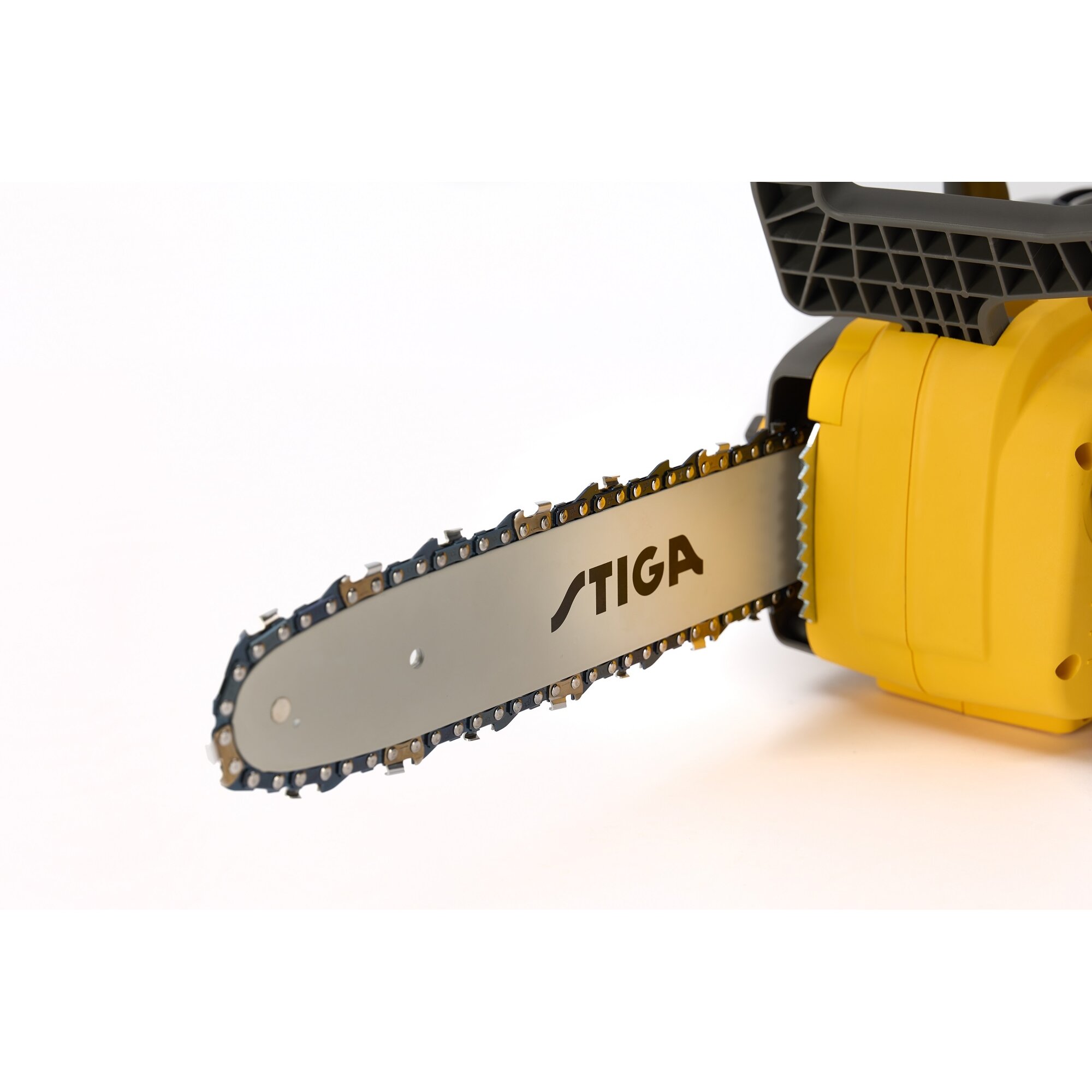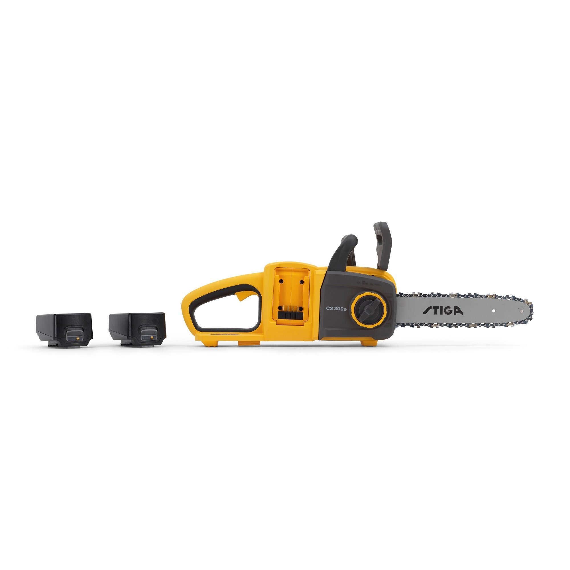 Naujosios 300-osios akumuliatorinės sistemos 20V grandininis pjūklas tai kompaktiškas ir lengvas įrankis. Su pilnai įkrautais dviem 20V – 4,0 Ah talpos akumuliatoriais galėsite dirbti iki 22 min., bei nupjauti iki 80 nuopjovų, 12 cm. skersmens medienos. Pateikiamas su 30 cm. ilgio pjovimo juosta ir grandine. Turi greitąją grandinės įtempimo sistemą. Maksimaliam saugumui užtikrinti pjūklas turi greitą grandinės sustabdymą, aktyvuojamą inercijos arba rankiniu būdu. Patogesniam valdymui plati šoninė rankena, bei viršutinė minkštos gumos rankena. Du „ePower 20V“ akumuliatoriai yra patogiai įkraunami tiesiogiai, naudojant visiškai naują STIGA įkrovimo sistemą. Patogus sieninis laikiklis, skirtas ne tik pakabinti įrankiams kuomet jie nenaudojami, bet ir įkrovimui. Naudodami šį prie sienos tvirtinamą laikiklį, sodo įrankius nedidelėje erdvėje laikysite patogiai ir tvarkingai.