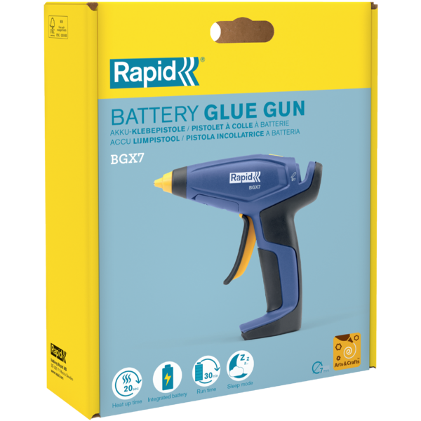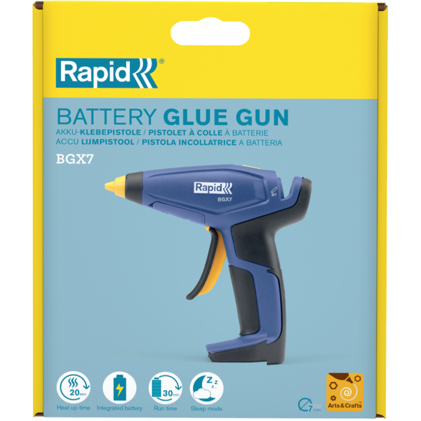 BGX7 yra belaidis kaštų klijų pistoletas, idealiai tinkantis menui ir amatams, taip pat smulkiems remonto darbams atlikti. Pilnai įkrautas veikia ik 30 minučių ir įkaista vos per 20 sekundžių. Pistoletas turi patogią automatinio išjungimo funkciją, kuri prailgina baterijos veikimo laiką ir padidina saugumą, nes užtikrina, kad jis nebūtų paliktas atsitiktinai įjungtas. Puiki ergonomika, įskaitant minkštą rankeną ir ilgą, gumuotą gaiduką, užtikrina patogų naudojimą ir lengvą valdymą, o guminis pagrindas padidina stabilumą, kai klijų pistoletas stovi ant darbinio paviršiaus. BGX7 maitinamas 3,6 V akumuliatoriaus, įkraunamas per patogų mikro-USB prievadą. Gali būti įkrautas greičiau nei per dvi valandas.
