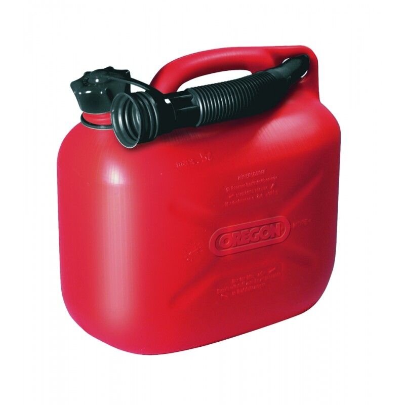 Oregon gamintojo 5 litrų talpos raudonas bakelis kurui su piltuvėliu.