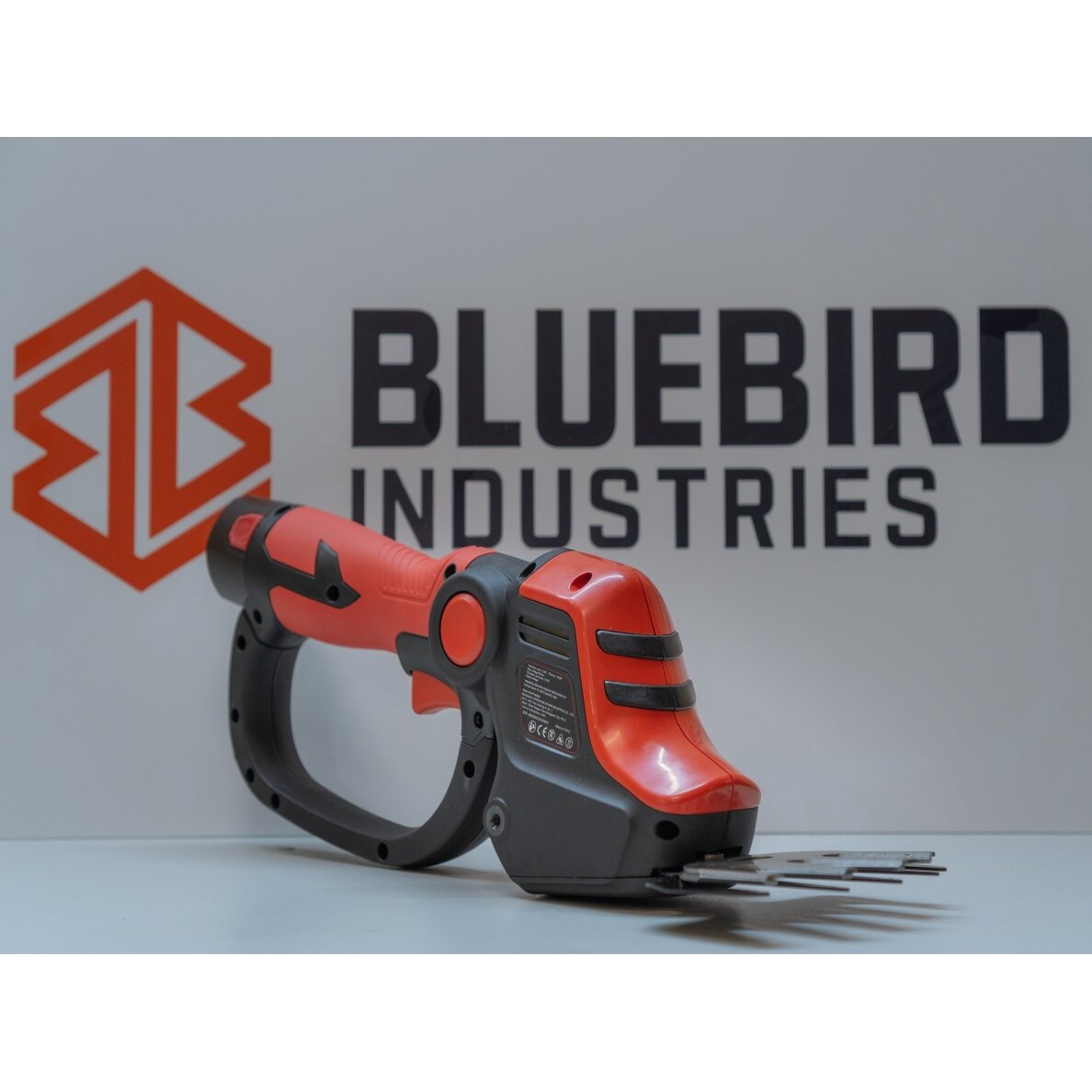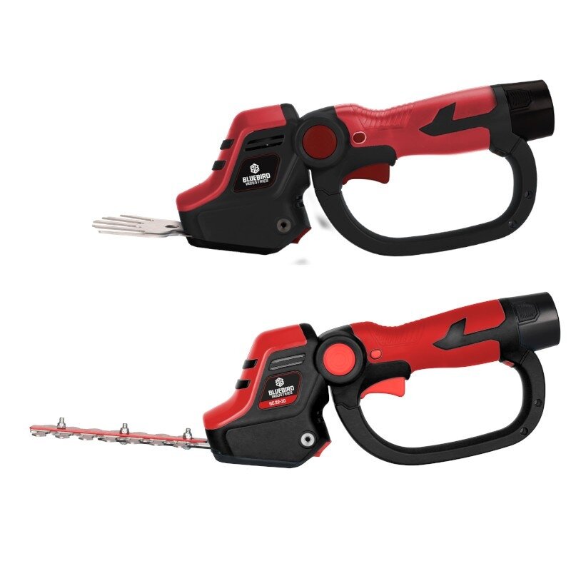 Blue Bird GC 22-10 akumuliatorinės žolės ir gyvatvorių žirklės Nedidelės, rankinės akumuliatorinės žirklės su dviem keičiamais ašmeninis – žolei ir gyvatvorėms pjauti. Su vienu įrankiu nesunkiai apipjausite žolę vejos pakraščiuose ar aplink augalus, bei padailinsite savo gyvatvorę ar augalus. Tai praktiškas ir patogus įrankis atliekantis dvi funkcijas. Ergonomiška ir neslidi rankena leidžia suimti įrankį patogiai, o mažas svoris nenuvargins rankos. Galima naudoti su papildomu priedu – prailginimo kotu, kuris leis patogiai dirbti nesusilenkus (perkamas atskirai).