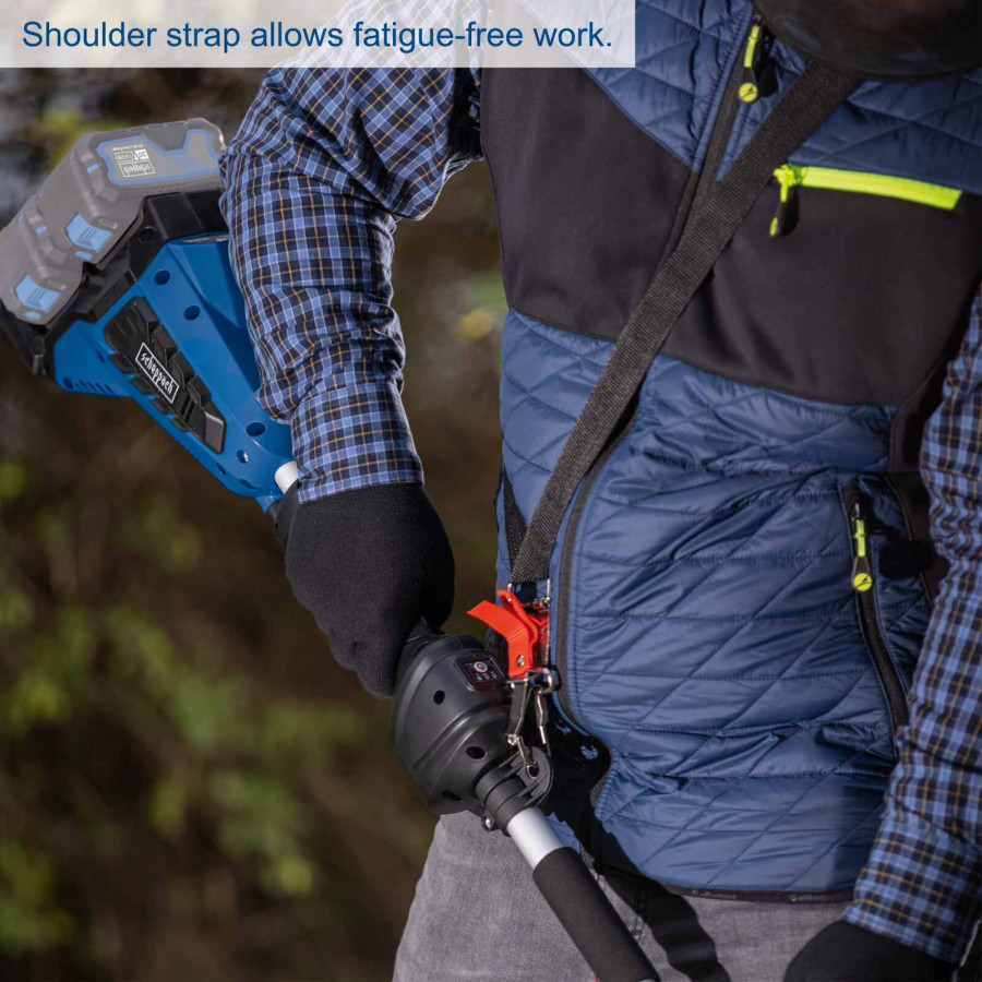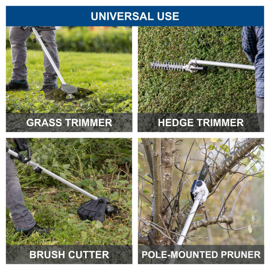 Lanksti kombinacija iš 4 skirtingiems darbams skirtų priedų: trimeris žolei su pjovimo galvute, peilis sumedėjusiai žolei pjauti, gyvatvorių ir gėnėjimo pjūklas