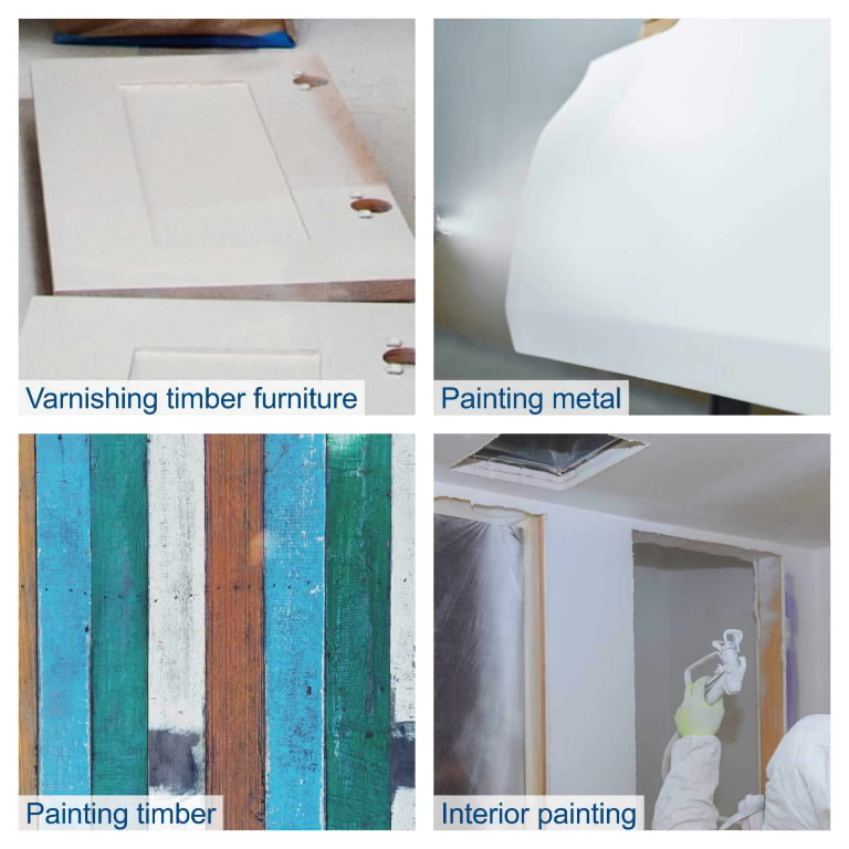 Galima purkšti šias medžiagas ir dažus: vandeniniai dažai, medienos apsaugos priemonės, aliejiniai dažai, gruntai, emalio dažai, antikorozinis gruntas, lakas, alyva,medienos beicas.