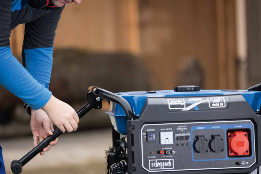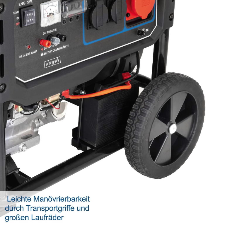 Generatorius turi tvirtą metalinį rėmą, kuris apsaugo įrenginį, taip pat yra su dideliais pripučiamais ratais, patogiomis rankenomis, kad būtų lengva transportuoti.