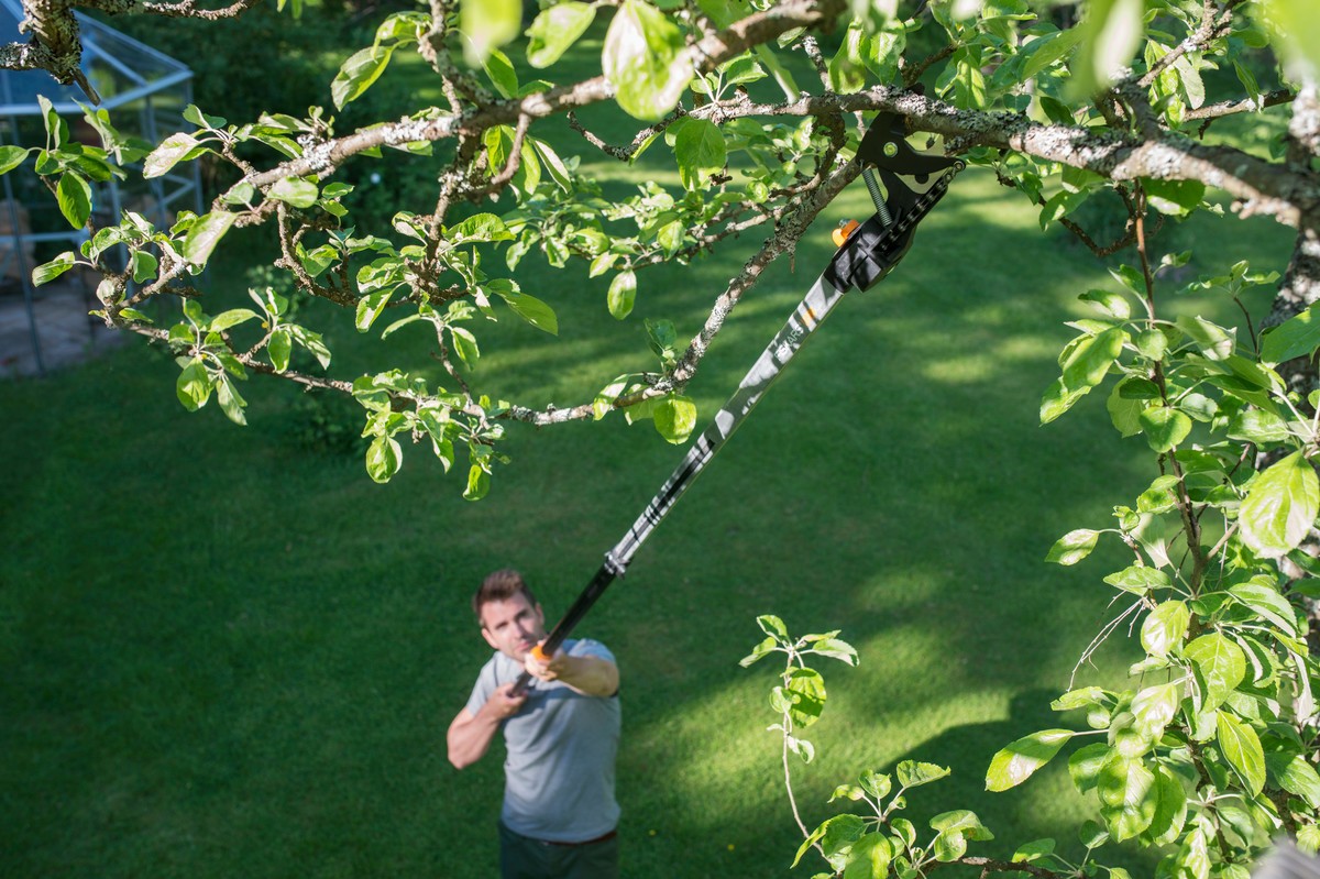 • „Fiskars UPN86“ teleskopinis genėtuvas – patikimas partneris jūsų sodui, tinkantis žalių šakų pjovimui iki 32 mm skersmens;