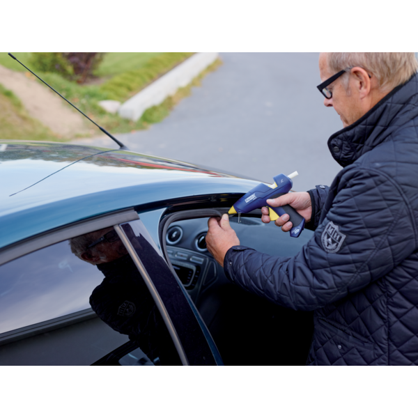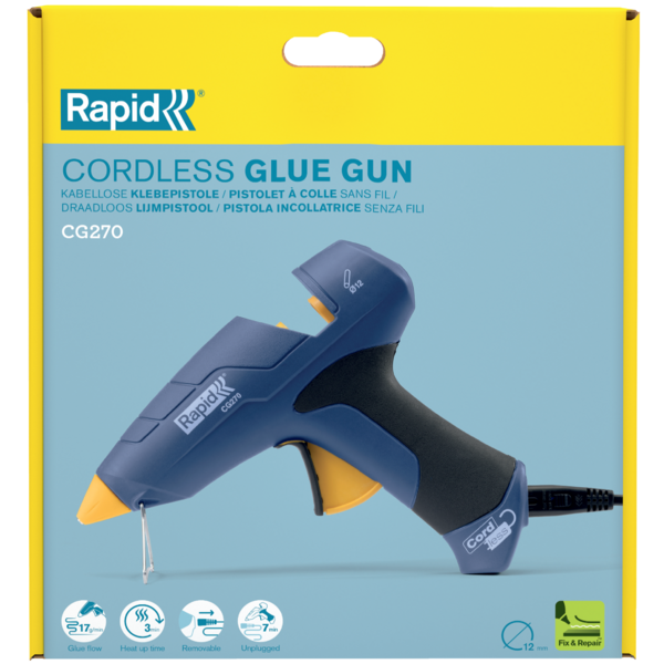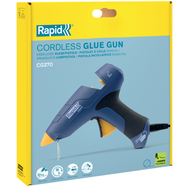 The ideal glue gun for a wide variety of jobs indoors and outdoors. The CG270 offers greater user comfort thanks to its cordless operation solution with the possibility to work up to 7 minutes without cord. Further benefits include a new, improved feeding and trigger mechanism designed to an increased yet smoother application of glue. The high glue output allows you to work more efficiently at high speed. An exchangeable nozzle (available separately) allows lines and dots of glue to be applied, increasing precision.