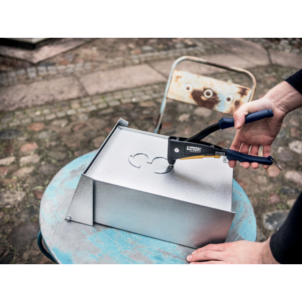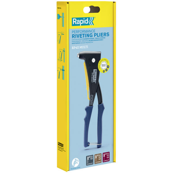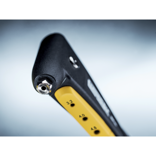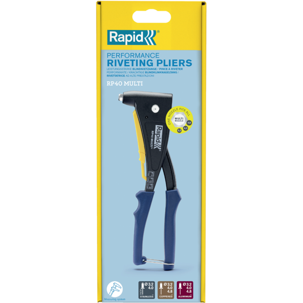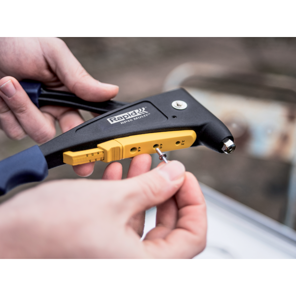 Nauja MULTI sistema, leidžianti įrankį naudoti su vienu antgaliu, visų dydžių kniedėms. „RP40 Multi” taip pat aprūpintas patogiu kniedės matavimo priedu.
