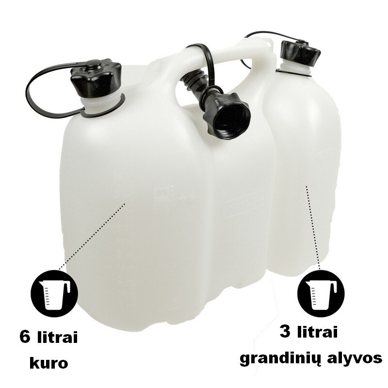 Kombinuotas bakelis kurui ir alyvai Oregon 6+3 l Baltas Kombinuotas kuro ir alyvos bakelis puikiai praverčia dirbant su benzininiu grandininiu pjūklu. Komplektuojamas su vienu užsukamu piltuvėliu. Kuro bakelio talpa – 6 litrai; Alyvos bakelio talpa – 3 litrai; Spalva – balta.