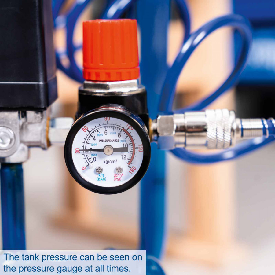 Variklis 1,1kW (230V), bako talpa 24 litrai, darbinis slėgis 8 bar, įsiurbimo galia 200 l/min, siurblys be alyvos, garso lygis 97 dB, kondensato vožtuvas ant bako.
