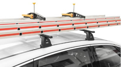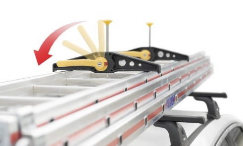 Greitas, saugus kopėčių tvirtinimas ant automobilio stogo laikiklių.