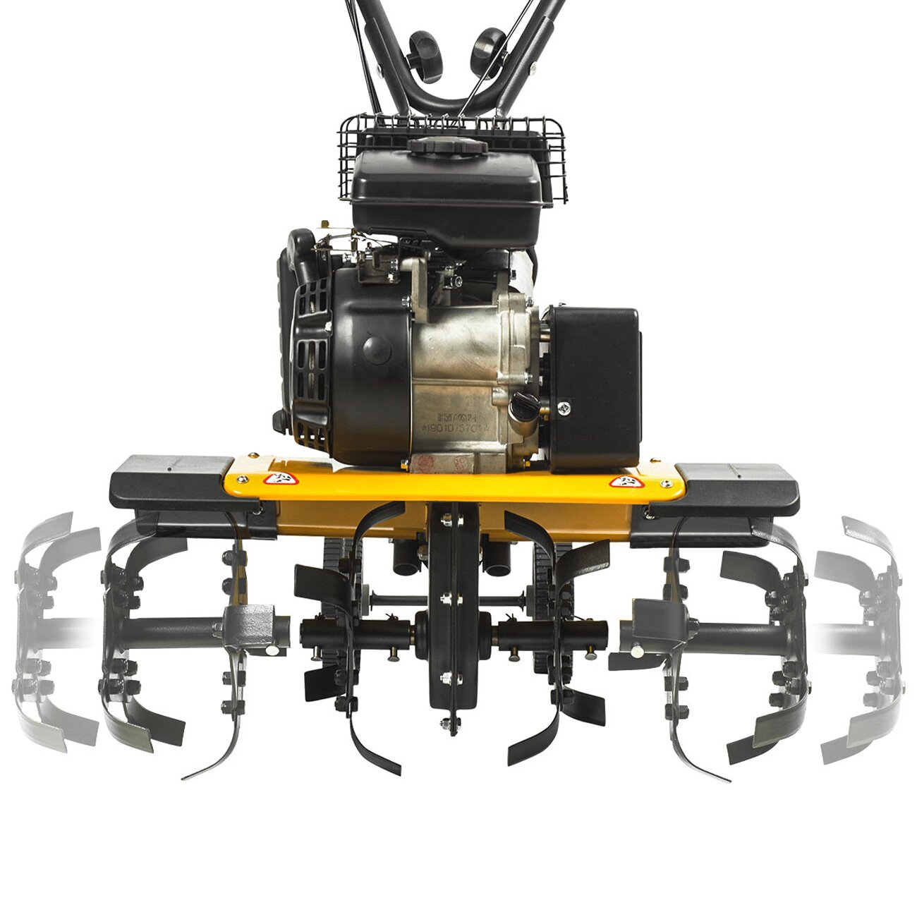 Darbinis plotis reguliuojamas trimis padėtimis – 28 cm, 40 cm ir 60 cm, todėl kultivatorių galima pritaikyti tiek siauriems tarpams, tiek didesniems plotams. Maksimalus darbinis gylis siekia iki 26 cm, užtikrinant kruopštų dirvos purenimą ir paruošimą sodinimui. Platesni apsauginiai sparnai dengia peilius net ir naudojant didžiausią darbinį plotį, taip padidindami darbo saugumą ir švarą.
