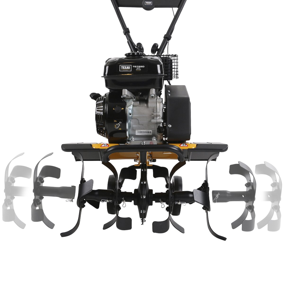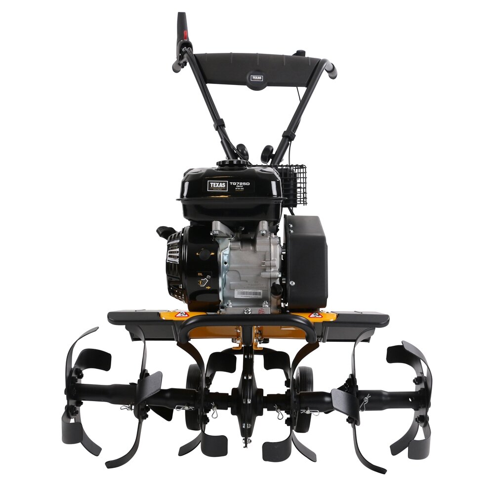 Įrenginyje sumontuotas TEXAS TG725D (212 cm³, 4.0 kW) benzininis variklis su dviem pavaromis – viena į priekį ir viena atgal. Tai užtikrina puikią kontrolę ir manevringumą net sudėtingomis sąlygomis. Frezos sukasi 110 aps./min. greičiu, kas suteikia stabilesnį, lėtesnį, bet labai tikslų darbą – tokia eiga leidžia lengviau valdyti įrenginį ir sumažina smūgius dirbant.