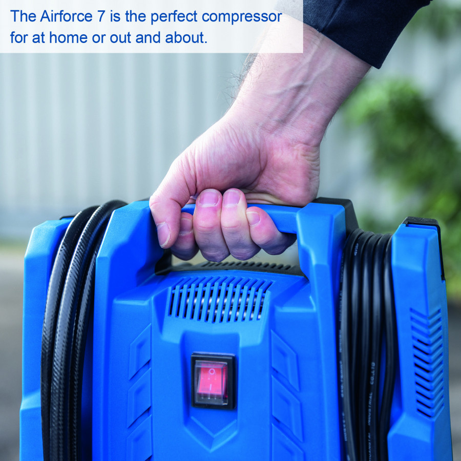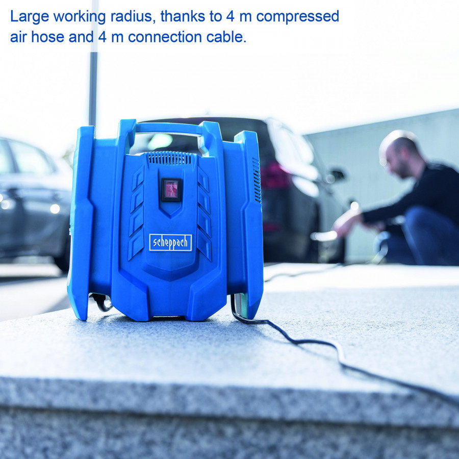 Suspaustas oras kelyje su Scheppach Airforce 7 nešiojamu kompresoriumi. Lagamino dizaino patogus kompresorius puikiai tinka dviračių ar automobilių padangoms, žaislams ir sporto įrangai pripūsti, pasiekiant maksimalų 8 bar darbo slėgį ir 180 litrų per minutę įsiurbimo našumą. Pridėti priedai – oro pistoletas, padangų pripūtėjas ir 3 adapteriai – gali būti laikomi ant įrenginio, taip taupant vietą.