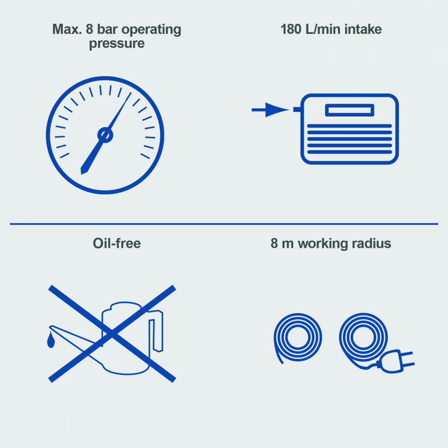 • Didelis darbo spindulys dėl 4 m oro žarnos ir 4 m jungiamojo kabelio