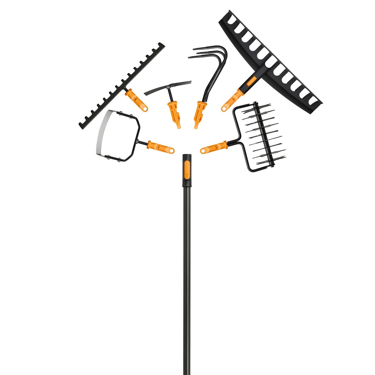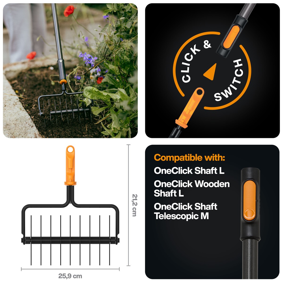 - Fiskars OneClick – tai sistema, kurioje vienas kotas gali būti derinamas su įvairiomis įrankių galvutėmis, leidžianti greitai ir patogiai atlikti skirtingus sodo darbus.
