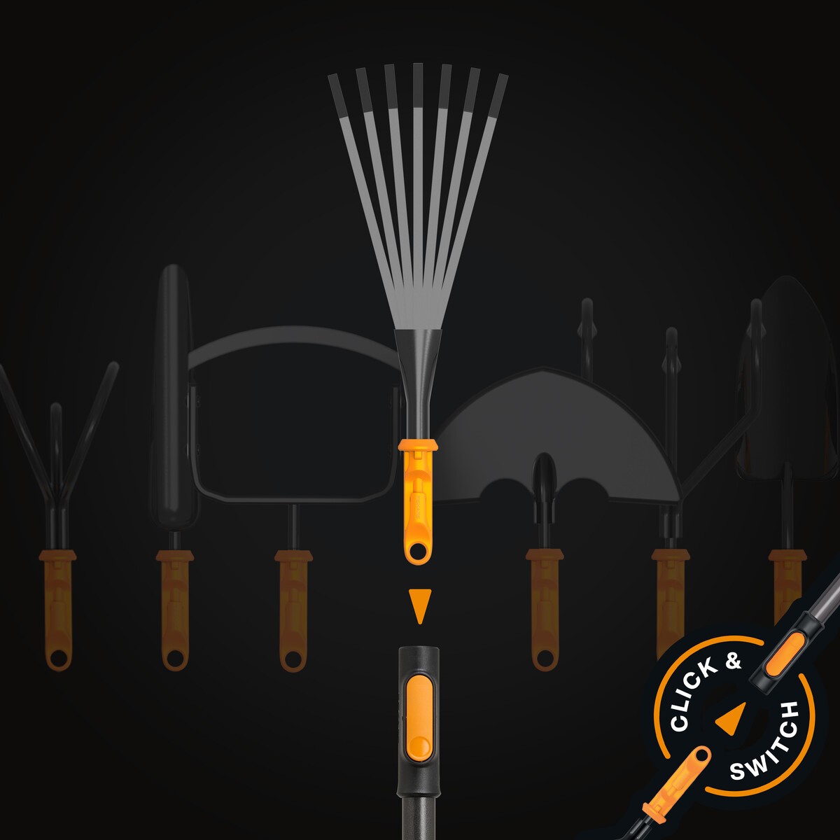 - Fiskars OneClick – tai sistema, kurioje vienas kotas gali būti derinamas su įvairiomis įrankių galvutėmis, leidžianti greitai ir patogiai atlikti skirtingus sodo darbus.