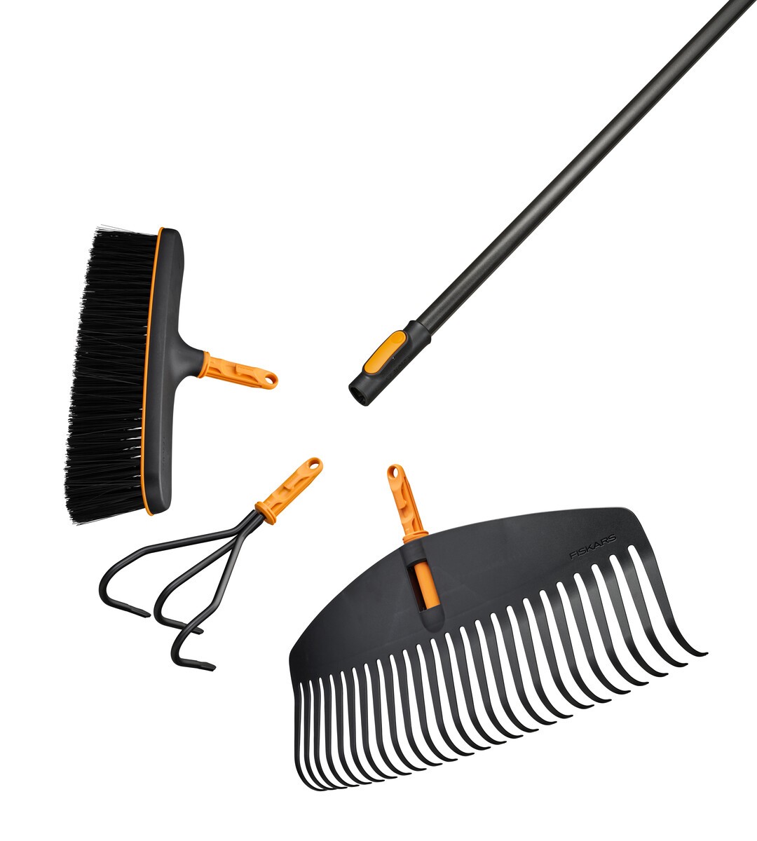 • Fiskars OneClick – tai sistema, kurioje vienas kotas gali būti derinamas su įvairiomis įrankių galvutėmis, leidžianti greitai ir patogiai atlikti skirtingus sodo darbus.