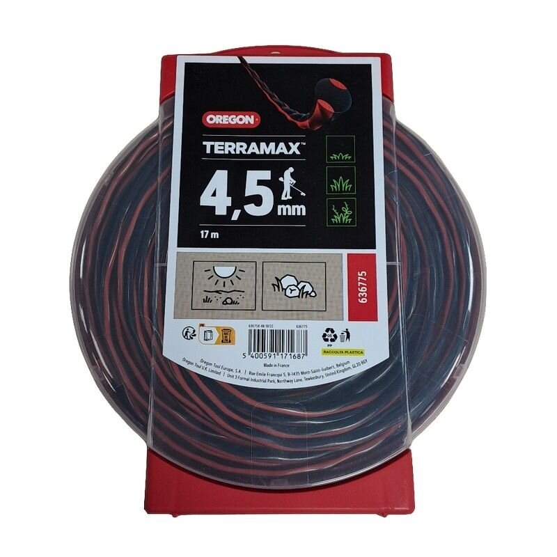 Oregon Terramax pjovimo valas 3,5mm/36m Visiškai naujas Oregon pjovimo valas TerraMax idealiai tinka profesionalams, dirbantiems atšiauriose, sausose ir akmenuotose vietovėse. Pagaminta iš aukštos kokybės kopolimerų mišinio, užtikrinančio didesnį tvirtumą ir standumą. Šis valas sukurtas ir pagamintas taip, kad padėtų atlikti darbą itin sudėtingomis sąlygomis. TERRAMAX valai pasižymi puikiomis savybėmis ir privalumais: Lengvai pjauna tankią ir tvirtą augmeniją atšiaurioje, sausoje ir uolėtoje vietovėje. Maksimaliai efektyvus ir greitas pjovimas. Lengvas valo padavimas naudojant „Tap and go” automatinio valo padavimo galvas. Pagamintas iš aukštos kokybės kopolimerų, užtikrinančių tvirtumą ir ilgaamžiškumą – atsparus trinčiai ir dilimui, sugeria smūgius ir sumažina lūžimą. Aerodinaminis dizainas.