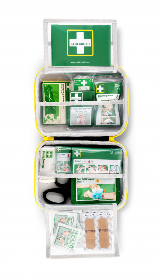 Cederroth“ pirmosios pagalbos rinkinys, M dydžio, pagamintas iš patvarios, į gumą panašios medžiagos, matinės dangos, kad dulkės, drėgmė ir nešvarumai nepatektų.