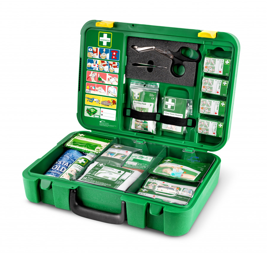 Didžiausias „Cederroth“ pirmosios pagalbos rinkinys, XL dydžio, pagamintas iš kieto plastiko, kad į pirmosios medicinos pagalbos priemones nepatektų dulkės, drėgmė ir purvas net ir sunkiomis sąlygomis.