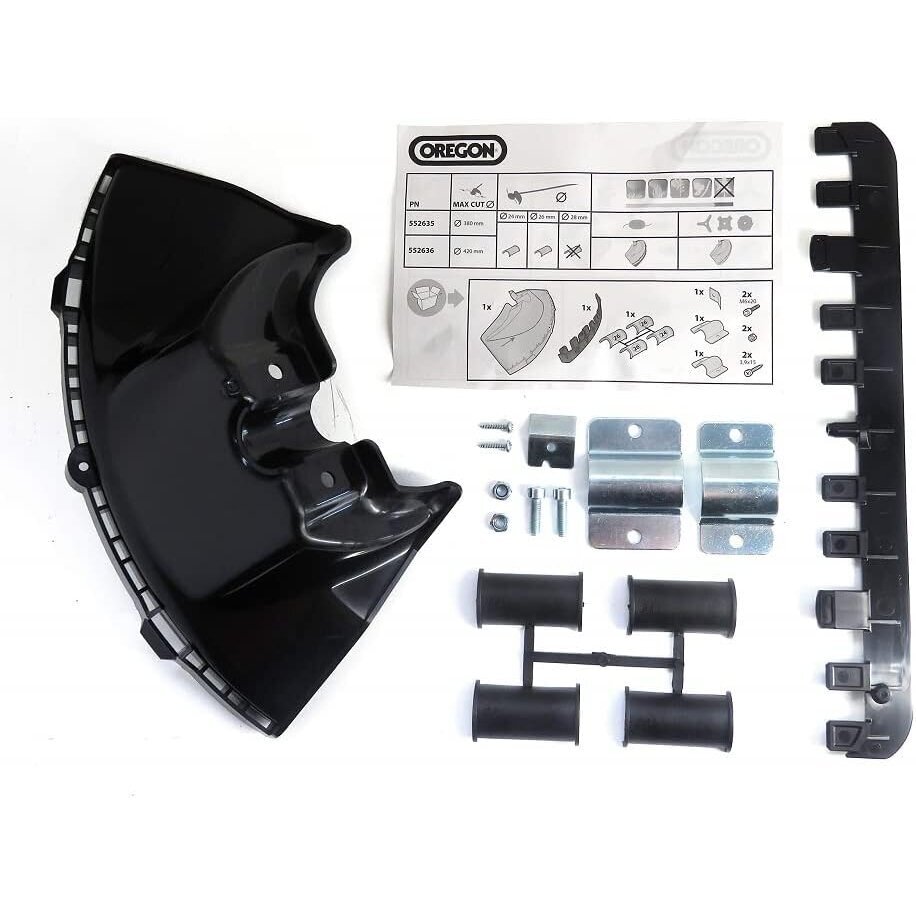 Oregon krūmapjovės apsauga, tinkama nailoninėms pjovimo galvutėms ir plieniniams peiliams. Lengvai ir greitai sumontuojama. Gerai apsaugo nuo išmetamų žolių, akmenukų ir kitų nešvarumų. Komplekte yra metaliniai tvirtinimo spaustukai ir montavimo rinkinys, tinkantis 24, 26 ir 28 mm skersmens kotams. Nuimama apatinė dalis skirta naudoti su nailonine galvute, turi nailono valo nukirpimo peiliukus. Tinka nuo 33 cc krūmapjovėms, maksimalus pjovimo plotis – 420 mm.