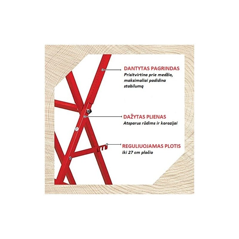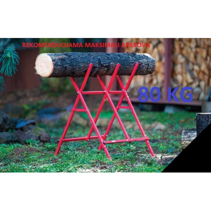 PRODUKTO APRAŠYMAS Tvirtas, lengvas ir nešiojamas plieninis stovas leidžia užtikrintai pjauti medieną grandininiu pjūklu Dantys prispaudžia medieną, maksimaliai padidindami pjovimo stabilumą Reguliuojamas plotis, iki 27 cm rąsto maksimali talpa Rekomenduojama maksimali apkrova 80 kg Dažytas plienas atsparus rūdims ir korozijai Svoris tik 7 kg