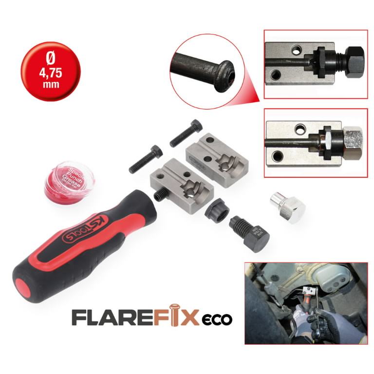 Būkite pirmas aprašęs “Stabdžių vamzdelių 4,75 mm briaunų lenkimo komplektas FLAREF FLAREFIXeco, KS Tools”