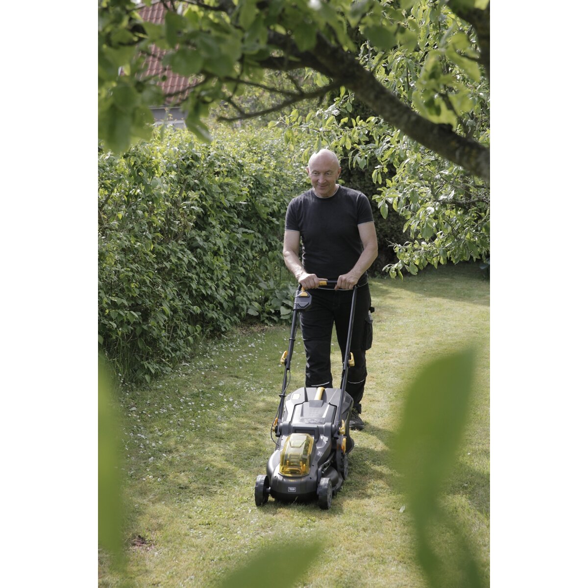 Akumuliatorinės vejapjovės pjovimo plotis – 33 cm, žolė renkama į 35 L talpos rinktuvą. Pjovimo sistema „du viename“ leidžia pasirinkti žolės surinkimo arba galinio išmetimo funkciją. Centrinis pjovimo aukščio reguliavimas turi 5 padėtis (nuo 25 iki 65 mm).